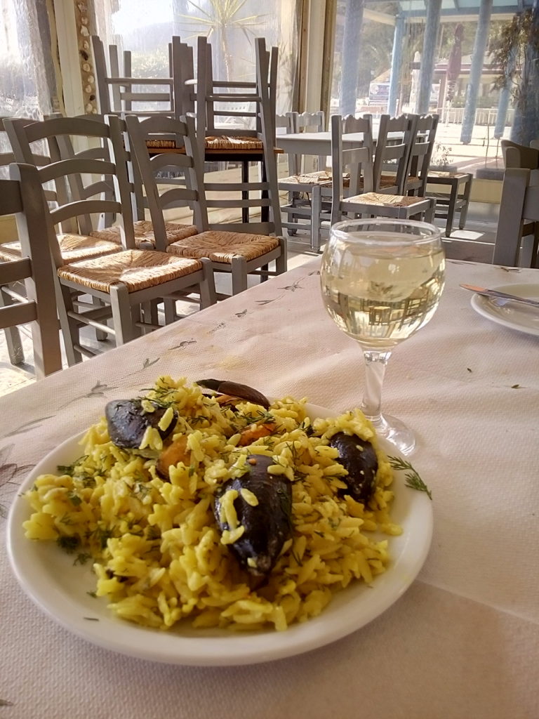 Jako już poznosili jakieś surowe obostrzenia, to można mi z tego Hotelu co mieszkam ruszyć gdzieś w okolice ciekawsze. Pojechałem więc do Lutraki zobaczyć co tam w trawie piszczy, jakie panny się tam kręcą, co u znajomych i nacieszyć się spacerem w greckim Saint Tropez. Kasyna, spa, wielki świat i pogoda dla bogaczy. Zobaczyć kto utył , komu zęby wypadły i kto jak wygląda. Niektórzy się sfilcowali trochę i zapleśnieli, łażą niedoczesani w porozciąganych dresach i innych barchanach, inni trzymają fason. Przedwczoraj jak byłem tam, to Fanis mnie zaprosił do siebie do tawerny na tajny obiad. Ale zrobił mi niespodziankę, ze hej bo pojawił się kurczak z rożna. A ja całą te okupację przeżyłem na kurczakach. W markecie galaxias, są kurczaki z rożna , 4,90 za kilo. No i jadłem to dwa miesiące w zasadzie codziennie. Zapytałem czy dzwonili do niego z marketu, że jestem jakimś koneserem kurczaków, czy sam tak od siebie? No to wczoraj się zrehabilitował i zrobił małże z ryżem kurkumowym.